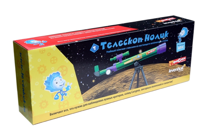 Телескоп Levenhuk Фиксики Нолик станет лучшим подарком для любого ребенка. С его помощью начинающий астроном сможет постигать тайны ночного неба и изучать различные астрономические объекты. Кроме того, с помощью этого телескопа можно вести и наземные наблюдения – это не только очень увлекательно, но и позволяет лучше освоить все основные функции прибора. Рефрактор Levenhuk Фиксики Нолик имеет сменные окуляры. С помощью окуляра 20 мм можно вести наземные и астрономические наблюдения, а обеспечивающий большее увеличение окуляр 6 мм лучше подходит для ночных наблюдений при спокойной атмосфере. Труба телескопа установлена на альт-азимутальной монтировке, простой в управлении даже для новичков. Для точного наведения имеется механизм тонких движений. Тренога изготовлена из пластика, благодаря чему отличается легкостью. Помимо самого телескопа, в комплект входят компас для правильного ориентирования во время астрономических наблюдений, ростомер и набор из трех постеров Levenhuk Фиксики, посвященных космической тематике. Плакаты отпечатаны на плотной мелованной бумаге формата А1 (84х60 см) и будут прекрасно смотреться на стене детской комнаты. Кроме того, они очень информативны, так что их изучение будет интересно не только ребенку, но и взрослым.