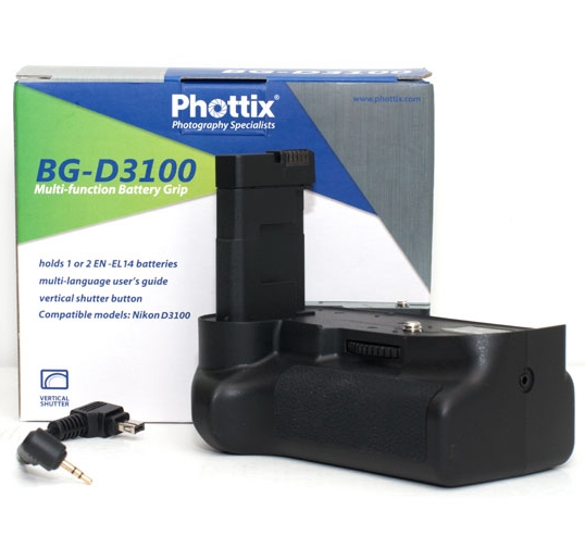Батарейный блок Phottix BP-D3100 для Nikon D3100 D3200 повышает скорость съёмки и увеличивает время автономной работы. Эргономичная конструкция рукоятки батарейного блока позволяет более удобно держать фотокамеру при съёмке в вертикальном положении. В качестве источника питания блока используются одна или две специальные аккумуляторные батареи EN-EL14 (в комплект не входят). Для удобства съёмки вертикальных кадров, на рукоятке расположены дополнительная вертикальная спусковая кнопка затвора. Короткий спусковой кабель соединяет батарейный блок с портом для дистанционного управления спуском фотоаппарата.