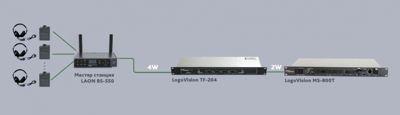 Для тех, кто использует в работе двухпроводные интерком системы и хотел бы расширить их функциональные возможности, может осуществить задуманное за счёт подключения беспроводной базовой станции LAON BS-550. Подключив базовую станцию LAON BS-550 к двухпроводной базовой станции, можно получить дополнительно до 32 полнодуплексных беспроводных абонентов. Система LAON за счёт цифровой высококачественной передачи несжатого аудиосигнала обеспечивает стабильную связь между всеми абонентами, а интерфейсное устройство Logovision - качественное преобразование четырехпроводных сигналов в двухпроводные и обратно. Для подключения к существующей двухпроводной системе базовой станции LAON BS-550 необходимо использовать универсальное интерфейсное устройство Logovision TF-204. |