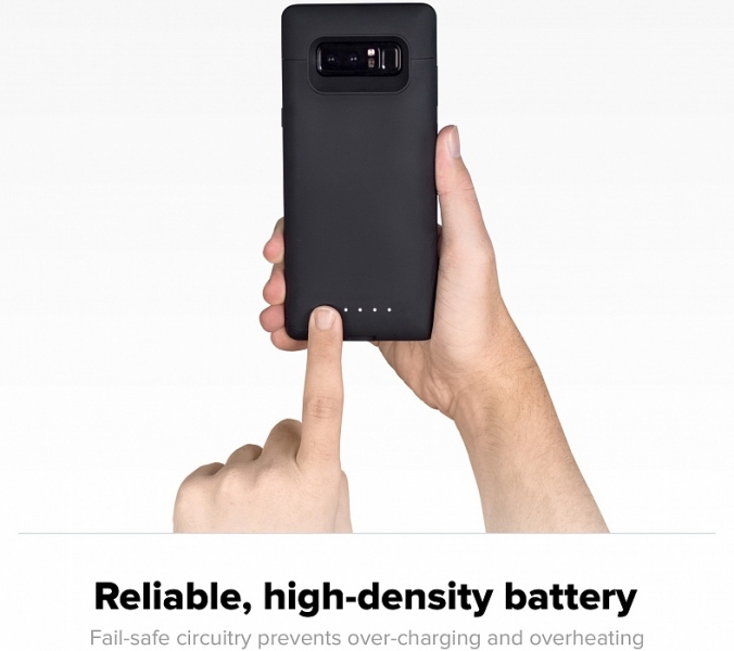 Mophie Juice Pack имеет встроенный аккумулятор емкостью 2950 мАч и обеспечивает более долгий срок службы штатной батареи Samsung Galaxy Note 8. Чехол имеет LED-индикацию, отображающую уровень заряда встроенной в него батареи. Модель поддерживает практически все виды беспроводных зарядок, а встроенные магниты позволят закреплять телефон в специальных держателях. Зарядка чехла осуществляется одновременно со смартфоном, при этом коммуникатор будет заряжаться первым.