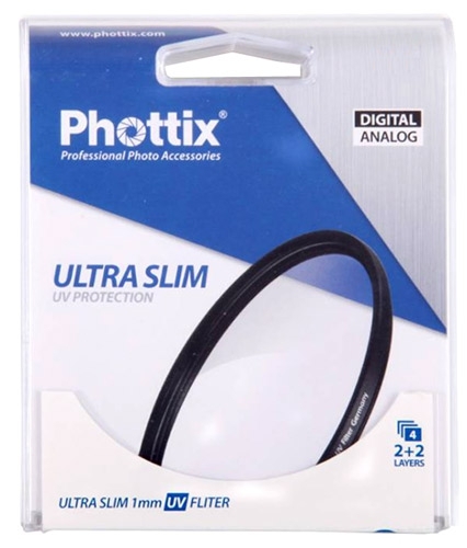 Бесцветный ультрафиолетовый светофильтр Phottix Ultra Slim с 2-х слойным просветлением в узкой оправе отсекает и поглощает ультрафиолетовое излучение, устраняет избыточный синий оттенок, снижает эффект «дымки» (haze) и повышает контраст. Особенно полезен в местах, где ультрафиолетовое излучение наиболее интенсивно: например, в горах или у водоемов.