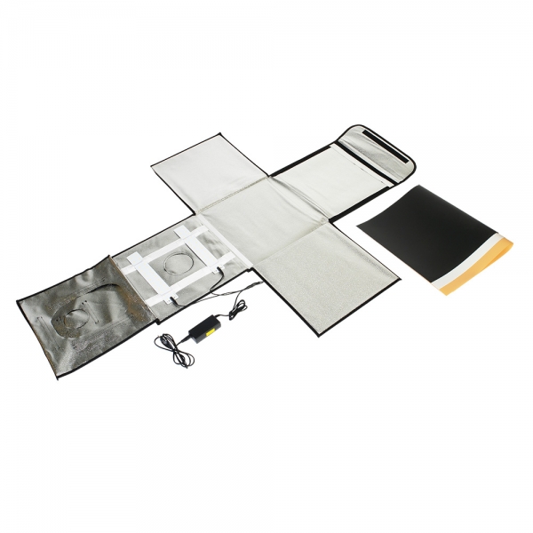 Фотобокс Falcon Eyes Light Cube 40 LED со светодиодным освещением Falcon Eyes Light Cube 40 LED - автономная мини-студия для фотографирования небольших объектов, внутренний размер фотобокса 40х40х40 см. Используется в предметной съемке для печатных каталогов, интернет-магазинов, Конструкция разворачивается в квадратный легкий фотобокс и оборудована своим собственным источника света с цветовой температурой 5500К. Внутренние серебристые текстурированные стенки равномерно заполняют куб отраженным светом от двух светодиодных линеек (по 28 светодиодов на каждой). Светодиодные линейки установлены на верхней крышке фотобокса, их можно легко переместить вдоль крышки благодаря системе липких лент (велкро). Монтаж конструкции осуществляется также с помощью липких лент, расположенных по периметру стенок. В сложенном виде занимает мало места, складывается в кейс с ручкой. Light Cube 40 LED имеет откидную переднюю панель со встроенным съемочным окном 18х28 см и отверстием диаметром 8,5 см, а также верхний люк диаметром 11 см для съемки с верхнего ракурса. Фотобокс поставляется с черным, белым и оранжевым пластиковыми фонами для размещения разных цветных предметов. Данная модель отличается от ранее представленных. В новых фотобоксах появился адаптер для регулировки яркости.