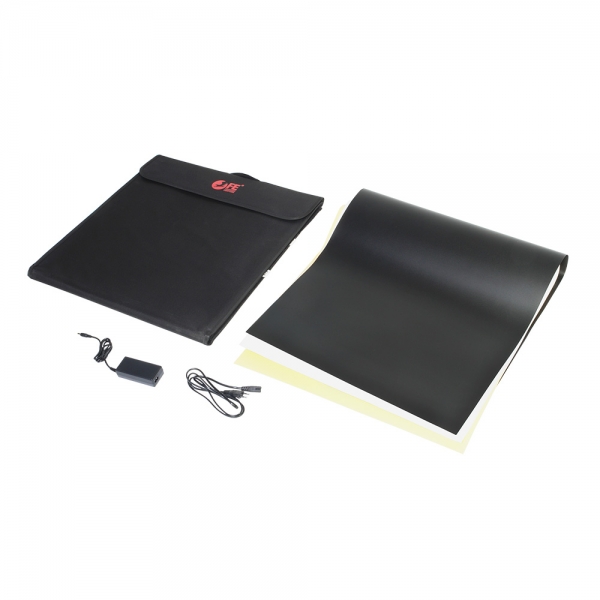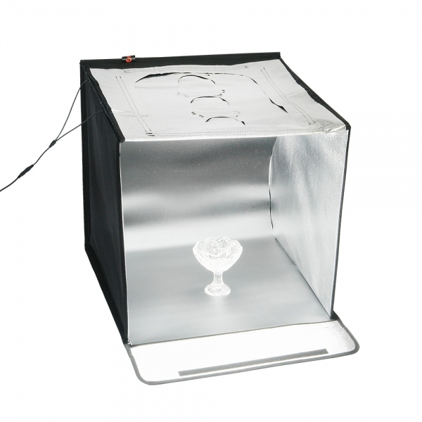 Конструкция разворачивается в квадратный легкий фотобокс и оборудована своим собственным источника света с цветовой температурой 5500К. Внутренние серебристые текстурированные стенки равномерно заполняют куб отраженным светом от двух светодиодных линеек (по 44 светодиода на каждой). Светодиодные линейки установлены на верхней крышке фотобокса, их можно легко переместить вдоль крышки благодаря системе липких лент (велкро). Монтаж конструкции осуществляется также с помощью липких лент, расположенных по периметру стенок. В сложенном виде фотобокс занимает мало места, складывается в кейс с ручкой.