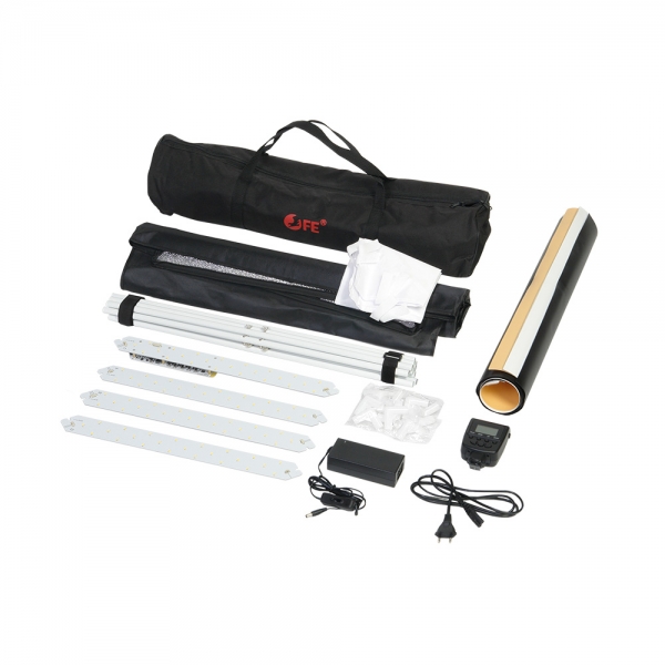 Фотобокс Falcon Eyes Macro Studio 60 LED со светодиодным освещением Комплексное решение для предметной съемки Falcon Eyes Macro Studio 60 LED это комплексное портативное осветительное решение для предметной съемки небольших и средних объектов, внутренний размер фотобокса 60х60х60 см. Четыре светодиодные планки и беспроводной пульт дистанционного управления позволяют профессионально управлять светом – мощность каждой планки регулируется независимо, а пульт позволяет запомнить до 8 настроек. Универсальный каркас Каркас фотобокса Macro Studio 60 LED представляет собой систему алюминиевых трубок, которые быстро соединяются между собой с помощью входящих в комплект угловых креплений. На 4 верхние трубки устанавливаются светодиодные планки. Входящий в комплект рассеиватель можно установить на верхнюю часть каркаса перед светодиодами, это позволит смягчить светотеневой переход. Стенки с серебристыми внутренними поверхностями соединяются между собой с помощью молнии и плотно прилегают к каркасу. На передней стенке расположено окно 20х30 см с отверстием диаметром 7 см на крышке, на верхней стенке находится окно диаметром 13 см с крышкой. При необходимости, переднюю и боковые стенки можно откинуть, а вместо боковых стенок на каркасе можно закрепить рассеиватели (дополнительные специализированные рассеиватели приобретаются отдельно). Беспроводной пульт дистанционного управления Контроллер способен сохранять в памяти до восьми вариантов световых схем, это позволит быстро переключаться между различными задачами и в любой момент продолжить прерванную съемку без предварительной настройки. Большой ЖК экран с подсветкой отображает всю необходимую информацию – активный режим работы, номер радиоканала, уровень яркости каждой планки, схему расположения планок в фотобоксе и заряд элементов питания. Режим Flash Светодиодные планки, входящие в комплект данного софтбокса, могут работать в режиме импульсного источника света с кратковременным увеличением мощности, это дает возможность кратковременно увеличить их мощность на один шаг экспозиции. При включении режима Flash и подготовке объекта к съемке светодиодные планки работают как источник пилотного света, это поможет оценить световой рисунок в момент срабатывания вспышки.