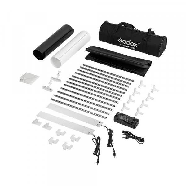 Фотобокс Godox LSD40 с LED подсветкой Конструкция фотобокса Фотобокс Godox LSD40 с LED подсветкой это готовая мини-студия для фотографирования небольших объектов, внутренний размер фотобокса 40×40×40 см. Используется в предметной съёмке: для печатных каталогов, интернет-магазинов и т. д. Компактность фотобокса в сложенном состоянии позволяет хранить его в любом шкафу. Также фотобокс отличается простотой сборки и разборки, использование инструмента для этого — исключено. Конструкция представляет собой трубчатый каркас с надетым на него кожухом с внутренними серебристыми отражающими поверхностями. На гранях кожуха фотобокса есть три отверстия закрытые клапанами на липучке. Два больших отверстия расположены на передней и верхней гранях фотобокса и предназначены для фотографирования объектов с разных ракурсов. Маленькое отверстие (на верхней грани) предназначено для заведения кабелей питания светодиодных линеек внутрь фотобокса. Фотографирование предметов также можно осуществлять полностью откинув переднюю грань фотобокса. Крепление светодиодных линеек производится за счёт пластиковых клипс (предусмотрены в комплекте) на верхние либо на вертикальные рёбра внутрь фотобокса (для крепления на вертикальные трубки и на горизонтальные предназначены разные клипсы). Для получения более рассеянного света, в комплекте предусмотрен тканевый светорассеиватель, фиксация которого осуществляется за счёт резиновых петель к трубчатому каркасу фотобокса. Для получения более качественного светотеневого рисунка — положение светорассеивателя можно регулировать по высоте. В комплекте предусмотрено два пластиковых полуматовых фона. Цвета фонов: чёрный и белый. Крепление фона к каркасу производится двумя комплектными прищепками. Освещение Освещение фотобокса осуществляется двумя мощными светодиодными линейками. С помощью кабеля со штекером, каждая линейка подключается к адаптеру питания Godox LSC2. Раздельная регулировка яркости линеек и их выключение производится за счёт двух диммеров, находящихся на корпусе адаптера питания. Суммарная мощность всех светодиодов составляет 40 Вт. Цветовая температура осветителей — 5800 К ± 200 К. Индекс цветопередачи CRI составляет более 96. Хранение и транспортировка Для хранения и транспортировки в комплекте предусмотрена мягкая нейлоновая сумка-чехол на молнии с ручками.