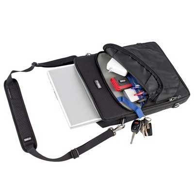 Тонкая фотосумка для ноутбука умещает компьютер 15". Передний карман служит для транспортировки кабелей и принадлежностей.