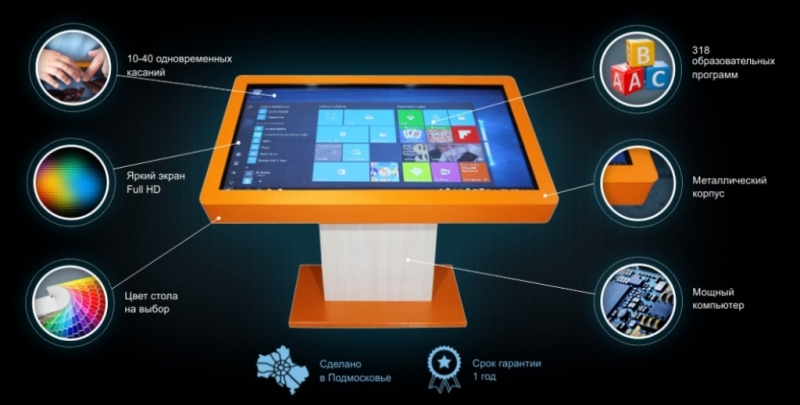 Интерактивный стол Project touch 32 создан в России, имеет металлический корпус без острых углов, специально для школ и других образовательных, и не только, учреждений. Диагональ дисплея составляет 81 см, такой размер позволяет двум-четырем пользователям, взаимодействовать со столом, не мешая друг другу. Интерактивный стол Project touch 32 имеет встроенный компьютер с установленным набором обучающих игр и акустику суммарной мощностью 20 Вт. Режим мультитач поддерживает 10 касаний одновременно. На боковой панели имеются два выхода USB 3.0.