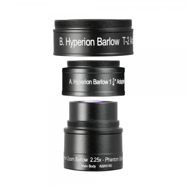 Линза Барлоу Hyperion 2,25х была специально разработана для окуляра Hyperion Zoom 8-24 мм Mark III. Без использования линзы Барлоу окуляр имеет фокусные расстояния от 8 до 24 мм, при присоединении линзы Барлоу Hyperion 2,25х диапазон фокусных расстояний становиться от 3,5 до 10,5 мм при сохранении отличного качества изображения при больших увеличениях для наблюдений планет, Луны.