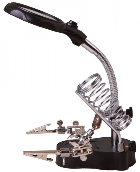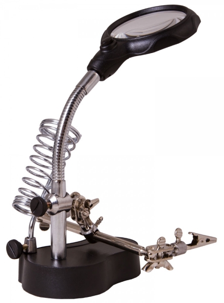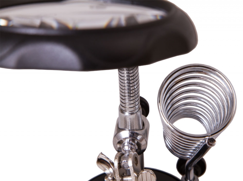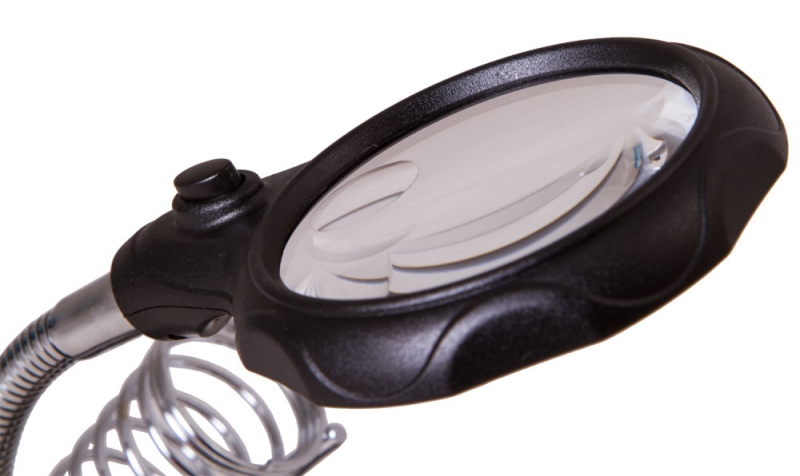 Лупа настольная Levenhuk Zeno Desk D3 Настольная лупа Levenhuk Zeno Desk D3 создана специально для тех, кто занимается ремонтом плат, пайкой, моделированием, ювелирными и часовыми работами. Держатель для инструментов и держатели «третья рука» станут настоящей находкой для человека, который любит работать руками. Бифокальная линза дает два увеличения. На большом диаметре кратность составляет 3,5х, на малом – 12х. Лупа зафиксирована на гибком штативе и снабжена встроенной подсветкой, состоящей из двух ярких светодиодов. Выключатель подсветки расположен у основания линзы.