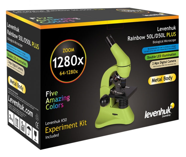 Главная отличительная черта серии 50L PLUS – самая высокая кратность среди всего семейства Levenhuk Rainbow. Благодаря качественной линзе Барлоу эти микроскопы позволяют исследовать препараты с увеличениями 64, 128, 160, 320, 640 и даже 1280 крат! Микроскопы Levenhuk Rainbow 50L PLUS комплектуются подпружиненными объективами – если при фокусировке задеть таким объективом препарат, особая конструкция убережет оптику от поломки. Надежные металлические корпуса способны выдержать даже очень частое применение – эти микроскопы можно использовать на школьных занятиях по биологии или для работы в лабораториях. Все модели Levenhuk Rainbow 50L PLUS поставляются в прочных пластиковых кейсах, которые защищают приборы от пыли и механических повреждений. Модель D50L PLUS с цифровой камерой заинтересует всех любителей современных технологий. Камера позволяет сохранять фотографии препаратов и записывать видеоролики – благодаря этому делиться результатами своих исследований с друзьями и коллегами очень просто. Модели серии Levenhuk Rainbow 50L PLUS выпускаются в пяти ярких цветах – вы без труда выберете свой идеальный микроскоп.