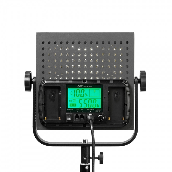 Falcon Eyes LE-576 LED - доступное решение для освещения съемочной сцены, обладающее полным функционалом старших моделей – регулировка цветовой температуры, DMX-управление, большой ЖК-дисплей, 4-лепестковые шторки, возможность питания от аккумуляторов серии NP-F, а также комплектуется пультом дистанционного управления.
