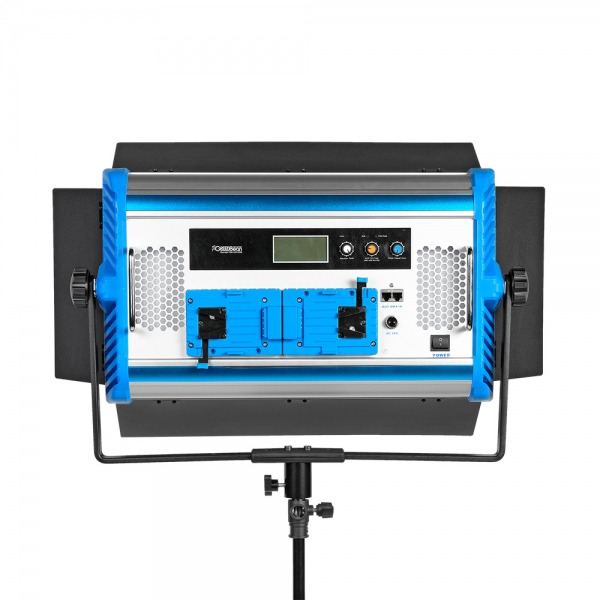 Осветитель оборудован двумя отсеками для аккумуляторов V-mount (аккумуляторы приобретаются отдельно) и комплектуется сетевым адаптером для питания от сети 100-240 В. Прим.: для установки аккумулятора в отсек слева, необходимо предварительно зажать кнопку блокировки аккумулятора.