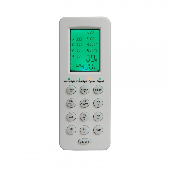 Управление мощностью, цветовой температурой или цветовым тоном осветителя также можно производить с помощью пульта дистанционного управления с ЖК-дисплеем, который входит в комплект поставки.
