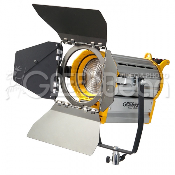 GreenBean Fresnel LED X2 – серия высокоэффективных светодиодных осветительных приборов направленного света. Применяется в качестве источника основного рисующего и контурного света, освещения фона, создания бликов, акцентирования деталей в студийной видеосъемке, съемке кинофильмов или ТВ-передач. Оптическая схема с линзой Френеля. Оптическая схема кинопрожектора состоит из сферического контротражателя и ступенчатой линзы Френеля. Линза Френеля обеспечивает преломление и концентрацию светового потока в узком угле рассеивания. Сзади на торце прибора находится рукоятка фокусировки светового пучка, которая перемещает контротражатель вместе с лампой вдоль оптической оси линзы Френеля, при этом меняется угол рассеяния. Мощность светодиода 180 Вт. Источником света служит светодиод мощностью 180 Вт (аналог галогенного 1200 Вт). В серии Fresnel LED X2 установлен новый светодиод с высоким индексом цветопередачи CRI, широкий спектр излучаемого света обеспечивает корректную передачу цветовых оттенков и приближает этот источник по своим свойствам к источнику естественного освещения. Светодиодные осветители отличаются надежностью, большим сроком службы лампы и минимальным тепловыделением. Экономия электроэнергии составляет до 80%. Цветовая температура 5500 К. Стабильная цветовая температура 5500К, даже при изменении мощности источника. В комплекте конверсионный фильтр 3200 К и матовый рассеивающий фильтр, которые быстро устанавливаются на креплении шторок магнитами. Плавная регулировка яркости. Прибор позволяет плавно регулировать яркость от 20% до 100% без искажения цвета. Быстросъемные восьмилепестковые шторки помогут ограничить световой поток в нужном направлении, чтобы получить световой акцент на объекте съемке или избежать нежелательной засветки объектива камеры. Последовательное подключение приборов к питающей сети. На панели управления Fresnel 180 LED X2 находится разъем для сквозного подключения приборов к сети 220В. Прибор комплектуется кабелем питания с евровилкой длиной 3 м и кабелем сквозного подключения длиной 1,5 м. Пульт дистанционного управления. Fresnel 180 LED X2 комплектуется пультом дистанционного управления прибора. Пульт позволит дистанционно включать и выключать прибор и регулировать яркость, без необходимости подходить к нему. Прочный корпус и встроенный вентилятор. Благодаря использованию металлического корпуса, осветитель устойчив к механическому воздействию. Осветитель комплектуется металлическим поворотным креплением. Встроенный в корпус вентилятор служит для защиты от перегрева.
