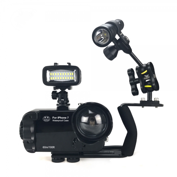 Три штативных гнезда снизу бокса, а также крепление типа "холодный" башмак, позволяет крепить рукоятки и армов для подводных фонарей. Также бокс может использоваться, как защитный чехол для вашего смартфона.