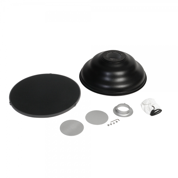 Портретная тарелка Falcon Eyes SuperSoft SR-60W white с сотами Falcon Eyes SuperSoft SR-60W – это комплект модификатора света, включающий 22-дюймовую белую портретную тарелку с алюминиевым дефлектором, дополнительный перфорированный дефлектор, нейлоновый диффузор, сотовую насадку 60° и кольцо с байонетом Bowens (152 мм). Новая форма тарелки захватывает свет и фокусирует его с максимальной эффективностью. Независимо от того в каком направлении световые лучи покинули осветитель, в тарелке новой формы они все равномерно перенаправятся на объект съемки. Белая отражающая поверхность формирует мягкий рассеянный световой поток, такой эффект может потребоваться в портретной съемке. Регулируемый дефлектор устанавливается в двух положениях, что позволяет выбирать результат действия тарелки. С дополнительным нейлоновым диффузором можно получить отличный инструмент для бестеневой предметной съемки. Также, установив перфорированный диффузор, можно добавить немного прямого света к мягкому отраженному от стенок и получить дополнительные возможности для работы на открытом воздухе при ярком солнечном свете.