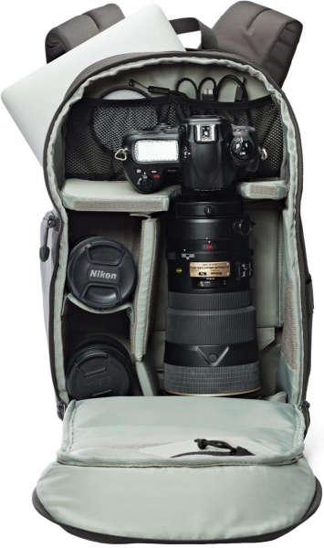 Рюкзак LowePro Transit Backpack 350 оснащен инновационной системой UltraFlex, которая представляет собой основную перегородку с множеством дополнительных. При ее использовании в сумке уместятся несколько небольших объективов. Если перегородку сложить, то пространство перестраивается таким образом, что в нем уже разместится один длиннофокусный объектив и несколько среднефокусных. Все перегородки можно убрать и использовать рюкзак как обычный городской и повседневный.