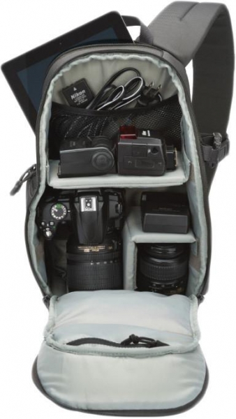 Рюкзак LowePro Transit Sling 250 AW оснащен инновационной системой UltraFlex, которая представляет собой основную перегородку с множеством дополнительных. При ее использовании в сумке уместятся несколько небольших объективов. Если перегородку сложить, то пространство перестраивается таким образом, что в нем уже разместится один длиннофокусный объектив и несколько среднефокусных. Все перегородки можно убрать и использовать рюкзак как обычный городской и повседневный.