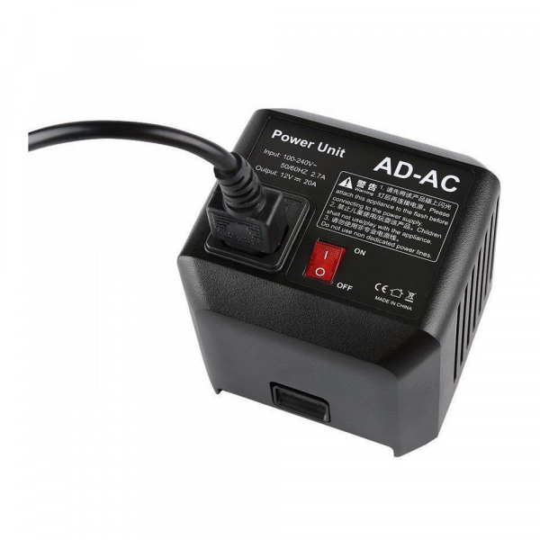 Адаптер постоянного тока Godox AD-AC предназначен питания от сети переменного тока вспышек Godox AD600, AD600M, AD600B, AD600BM, а также аккумуляторного светодиодного осветителя Godox SLB60W. Может использоваться для питания. Корпус адаптера изготовлен из пластика. На тыльной стороне находятся: разъём питания для подключения адаптера к сети переменного тока, выключатель с индикацией, и гнездо для предохранителя. Адаптер имеет активное охлаждение, с правой и левой стороны корпуса предусмотрены щели воздушного охлаждения. Фиксация адаптера на корпусе вспышки осуществляется подпружиненной кнопкой на нижней поверхности адаптера. Крепление адаптера осуществляется на направляющие на корпусе вспышки за счёт пазов в стальной пластине на корпусе адаптера. Подключение адаптера к источнику питания осуществляется комплектным кабелем длиной около 5 м.