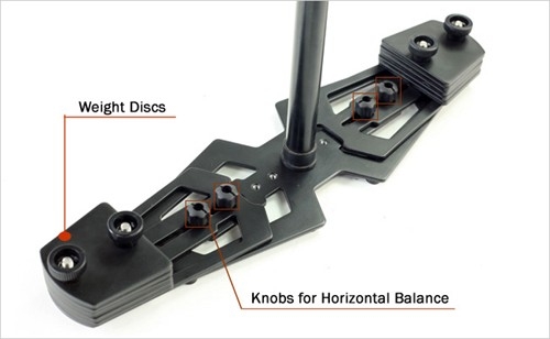 • Балансировка камеры: В комплекте с данной моделью стедикама поставляются 10 противовесов для наиболее точной балансировки камеры. Балансировка камеры достигается путем установки их необходимого количества. Положение быстросъемной площадки регулируется из стороны в сторону, вперед и назад, что помогает достичь максимально точного баланса камеры в горизонтальной плоскости. Для балансировки камеры по вертикали нужно установить необходимое количество противовесов на балансировочную платформу. Правильная балансировка камеры делает стедикам легко управляемым и удобным в работе.