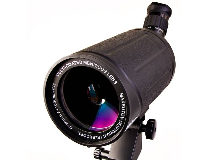 Зеркально-линзовая конструкция, построенная по классической схеме Максутова-Кассегрена. Эта зрительная труба и светосильная (диаметр 90мм, она собирает на 65% света больше, чем аналогичные с диаметром 70 мм) и удивительно компактная (ее длина всего 300мм). Влагозащищенное исполнение. Металлический прямой корпус покрыт толстой нескользящей резиной. Изображение четкое, резкое без окрашенности по краям. При зуммировании, для сохранения резкости, требуется легкая подфокусировка - совершенно необременительная для наблюдателя.