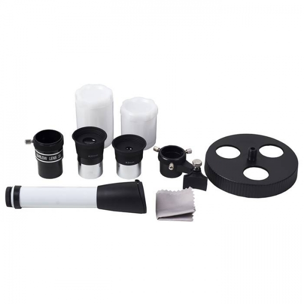 Телескоп Veber 700*70 AZ Белый - это линзовый телескоп (рефрактор), который дает четкое и контрастное изображение, хорошо подходит для путешествий. Просветленный ахроматический объектив диаметром 70мм, собирает в два раза больше света , чем 50мм и позволяет наблюдать не только небесные, но и очень удаленные земные объекты. Картинка резкая, без окрашенности изображения по краю поля зрения. В этот телескоп вы сможете увидеть детали на дисках планет, кратеры Луны размером 5-6 км, многие туманности и звездные скопления (вплоть до 12 m звездной величины). Для земных наблюдений мы рекомендуем использовать окуляр PL-20, с которым увеличение телескопа будет 35x, при этом ближняя точка фокусировки составит 12,5 м. Этот телескоп дает прямое (не перевернутое) изображение. Наличие в окулярном блоке оборачивающей призмы (а не диагонального зеркала, как в аналогичных моделях других фирм), делает изображение изображение не зеркальным (где левое и правое меняются местами), а таким, каким обычно вы видите его невооруженным глазом. Для удобства наблюдения (из положения стоя или сидя), окулярную часть вместе с призмой можно поворачивать, 8 фиксированных положений. С помощью искателя (входит в комплект, увеличение 6х, крепится к телескопу) можно быстро навестись на цель наблюдения. Телескоп снабжен азимутальной монтировкой AZ (металл) белого цвета. Такой монтировкой удобнее пользоваться если вы наблюдаете наземные объекты. Всего одна ручка позволяет управлять прибором и по вертикали и по горизонтали. Имеется фиксатор найденного положения. Телескоп поставляется с алюминиевым штативом с возможностью регулировки высоты. Распорки для ножек служат не только для повышения устойчивости, но и в качестве подставки под полочку для аксессуаров (идет в комплекте). Сумка для переноски, в которую укладывается весь комплект, позволяет безопасно (для оптики и внешнего вида) транспортировать прибор для выездов на природу или при походах в гости.